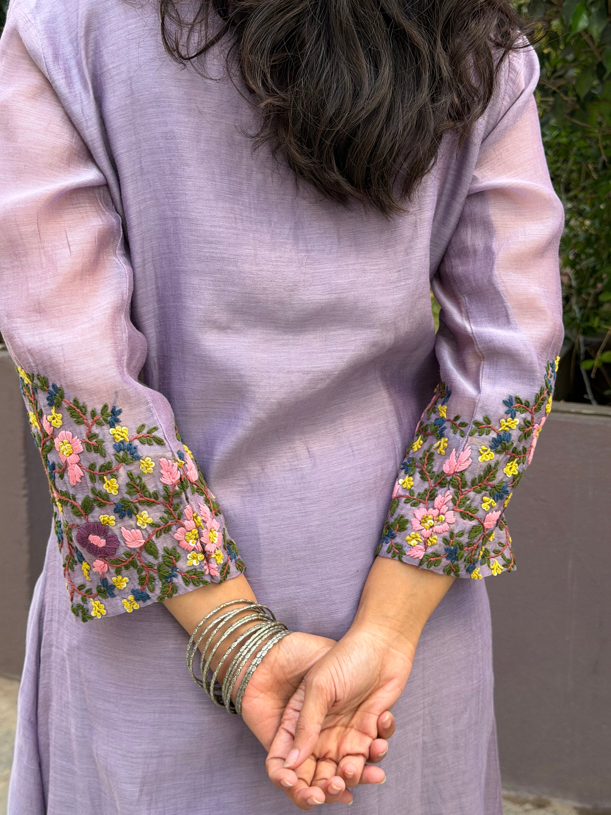 lavender mul chanderi coord set with lace & hand embroidery detailing