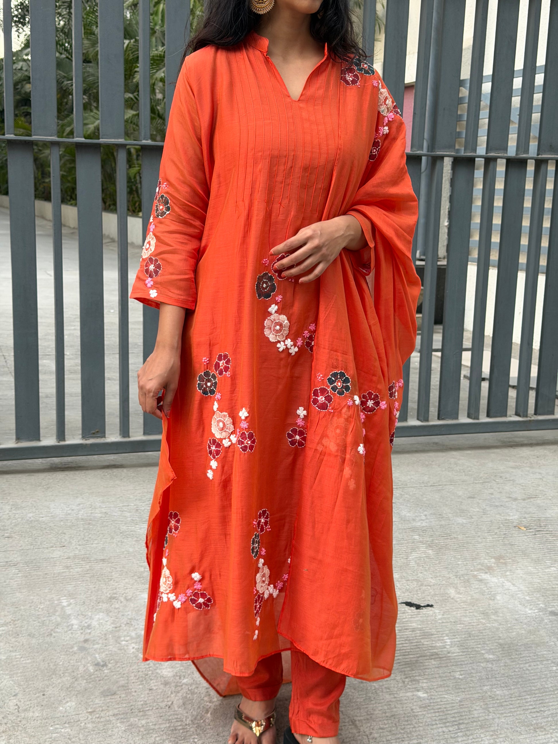 A0605 Orange Mul Chanderi 3pc set with hand paint and embroidery detailing