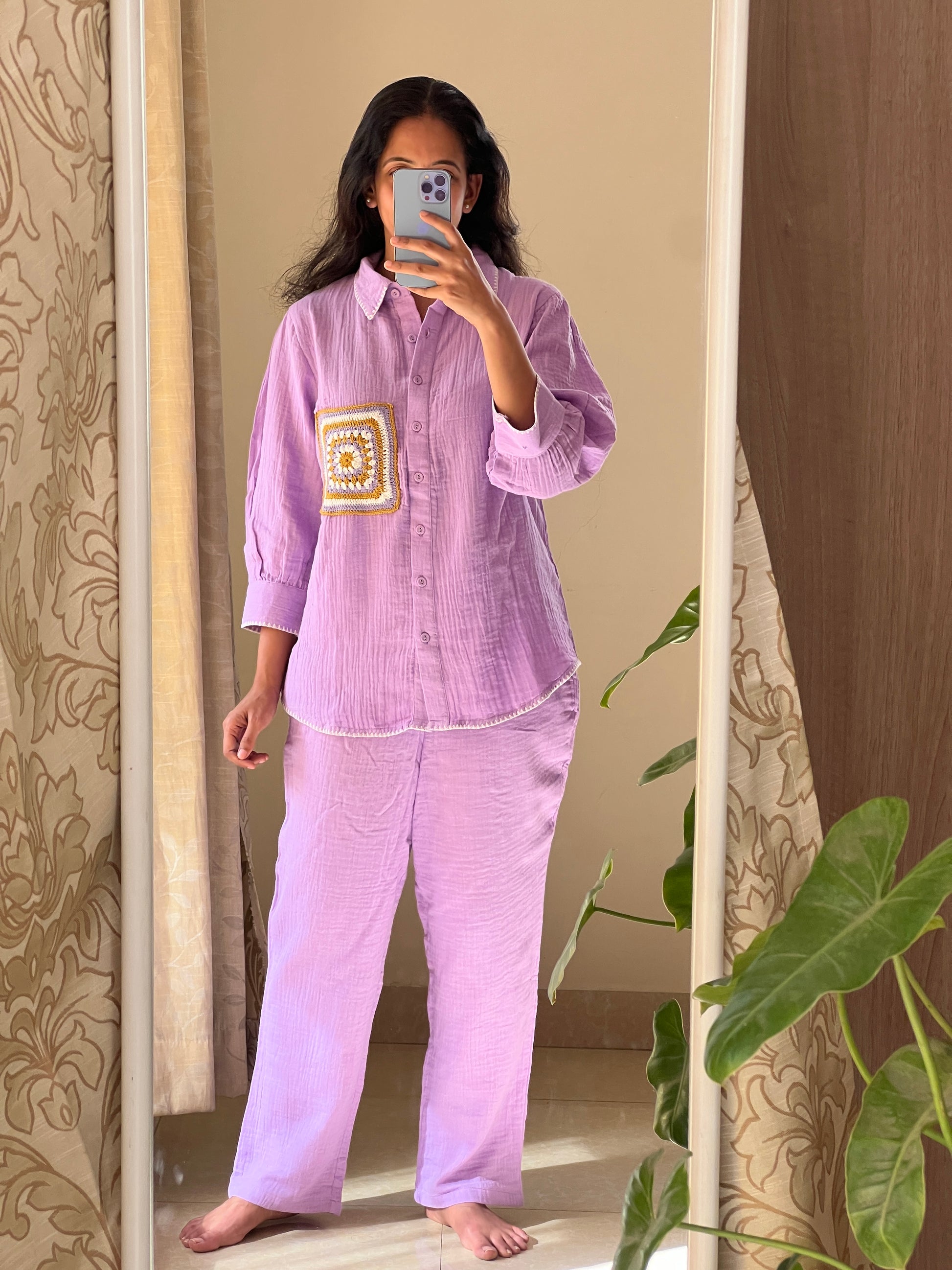 lavender crushed cotton coord set with crochet lace patch work detailing