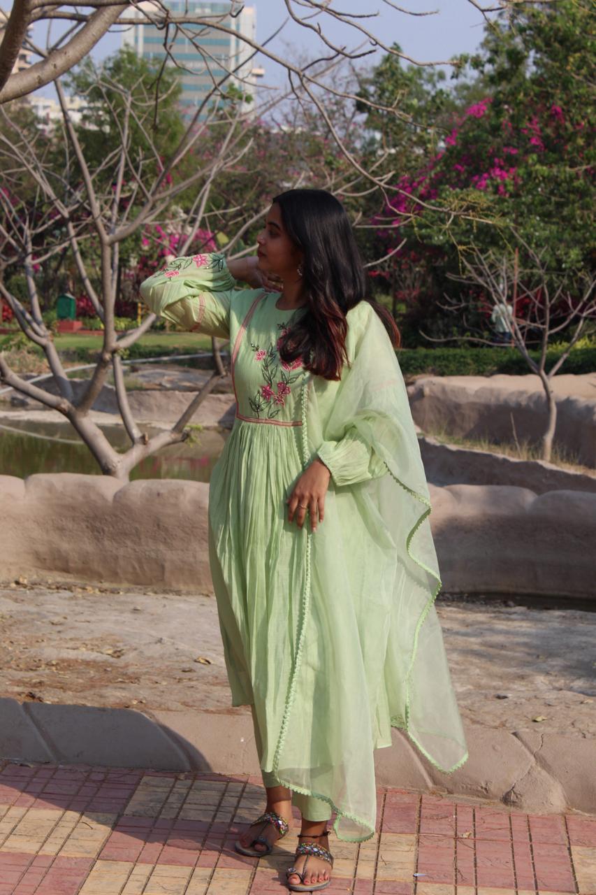 A0333 green Premium Mul chanderi 3 piece set with Applique work detailing